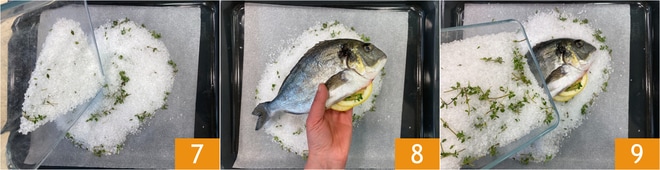 Versez sur la plaque, recouverte de papier sulfurisé, moins de la moitié du sel aromatisé 7, déposez dessus la dorade 8 et couvrez avec le reste du sel, en l'adhérant bien au poisson 9. Faites cuire dans un four statique, préchauffé, à 200°C pendant 25-30 minutes.