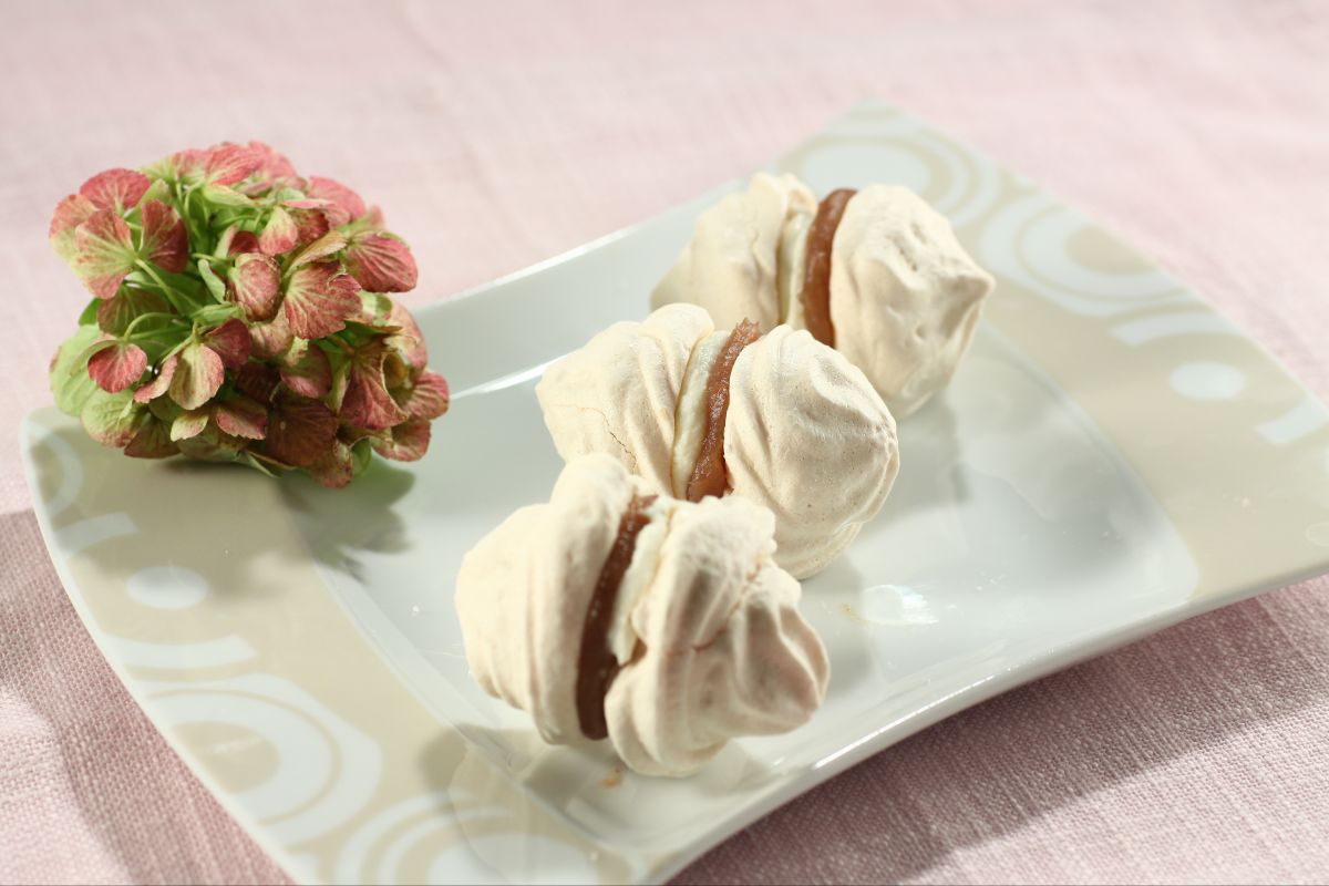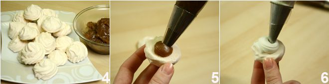 Lorsque les meringues sont prêtes et refroidies 4, mettez la crème de marrons dans une poche à douille avec une douille lisse et en pressez un peu 5 sur la partie plate de la moitié des meringues préparées. Montez la crème, et de la même manière que la crème de marrons, garnissez la partie plate de l'autre moitié des meringues 6. Accouplez les deux moitiés et mettez-les au réfrigérateur pour refroidir, ensuite servez-les.