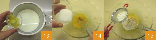 Pendant que les douceurs sont au four, passez à la préparation de la crème pâtissière : versez le lait dans une casserole, ajoutez le zeste de citron 13 et portez-le à frémissement. Pendant ce temps, mélangez les jaunes d'œufs et le sucre dans un bol 14 et battez avec un fouet à main jusqu'à ce qu'ils soient bien mousseux, puis ajoutez la fécule de maïs tamisée 15