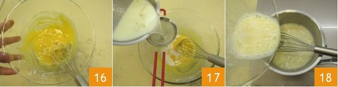 et mélangez à nouveau avec le fouet pour rendre le mélange homogène 16. À ce stade, le lait est presque à ébullition, alors versez-le dans le bol avec les jaunes d'œufs à travers une passoire, pour éliminer le zeste de citron 17, et mélangez à nouveau. Enfin, versez à nouveau le mélange obtenu dans la casserole 18