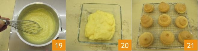 et portez-le à ébullition, en mélangeant pendant 4-5 minutes à feu doux 19. Une fois que la crème a épaissi, transférez-la dans un plat en verre 20 et couvrez-la de film plastique au contact ; laissez-la refroidir à température ambiante, puis conservez-la au réfrigérateur. Pour plus d'informations sur la procédure, vous pouvez consulter la recette de la Crème pâtissière. Une fois le temps de cuisson des douceurs écoulé (elles doivent être dorées à l'extérieur mais pas sombres), transférez-les sur une grille et laissez-les refroidir complètement 21.