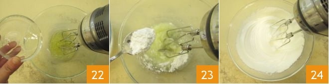 Entre-temps, passez à la préparation du glaçage royal : versez les 90 g de blancs d'œufs dans un bol et ajoutez quelques gouttes de citron 22, puis commencez à fouetter avec le fouet électrique en ajoutant une cuillère de sucre glace à la fois 23. Continuez à fouetter jusqu'à ce que le sucre glace soit complètement incorporé et que le glaçage soit homogène et sans grumeaux 24, puis couvrez-le de film plastique au contact. Pour plus d'informations sur la procédure, vous pouvez consulter la recette du Glaçage royal.