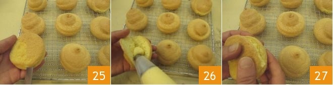 Vous pouvez maintenant assembler les douceurs soupirs : retirez la crème du réfrigérateur et transférez-la dans une poche à douille avec une douille lisse de 15 mm de diamètre ; prenez les petits gâteaux refroidis et faites une coupe parallèle à la base, en veillant à la laisser attachée d'un côté pour ne pas l'enlever complètement 25. Remplissez l'intérieur des petits gâteaux avec la crème 26, refermez-les délicatement 27 et reposez-les sur la grille ; procédez de la même manière avec tous les soupirs.