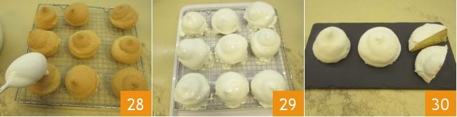 Lorsque tous les soupirs sont garnis, recouvrez-les entièrement de glaçage royal en le versant sur le dessus avec une cuillère et en le laissant couler le long des côtés 28. Laissez sécher les soupirs sur la grille pendant 3-4 heures à température ambiante (pas au réfrigérateur), en veillant à placer un plateau en dessous pour recueillir le glaçage en excès 29. Une fois secs, vos douceurs soupirs sont prêtes à être servies 30 !