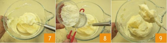 et mélangez délicatement de bas en haut avec une spatule, en veillant à ne pas les faire retomber 7. Lorsque le mélange d'œufs est bien homogène, ajoutez la farine en 2-3 fois en la tamisant directement dans le bol à l'aide d'une passoire 8 et mélangez délicatement de bas en haut avec la spatule pour éviter de casser la pâte 9.