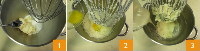 Pour préparer la drip cake, commencez par réaliser la pâte de base. Faites fondre le chocolat blanc et laissez-le tiédir. Dans le bol du batteur, versez le sucre en poudre, le beurre mou, l'extrait de vanille 1 et travaillez pendant environ 1 min avec le fouet. Éteignez le batteur et ajoutez les œufs 2. Travaillez le mélange jusqu'à absorption complète des œufs, puis ajoutez le chocolat blanc, désormais tiédi 3.