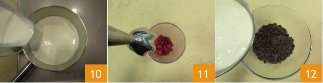 Versez la crème restante dans une casserole 10 et portez à ébullition. Versez les framboises dans un récipient à bords hauts et mixez avec un mixeur plongeant 11 jusqu'à obtenir une purée. Transférez le chocolat dans un bol et dès que la crème commencera à bouillir, versez-en la moitié sur le chocolat 12.