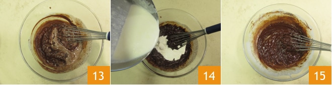 Mélangez avec un fouet 13 et versez ensuite le reste de la crème chaude 14. Mélangez le mélange jusqu'à dissolution complète du chocolat 15.