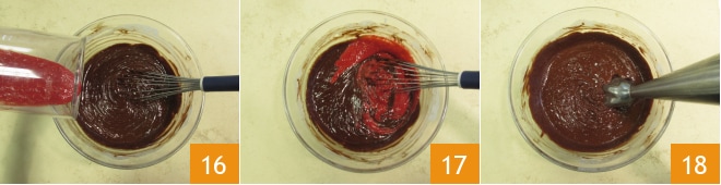 Versez la purée de framboises dans la ganache 16, mélangez bien avec un fouet 17, puis mixez légèrement avec le mixeur plongeant sans incorporer d'air 18.