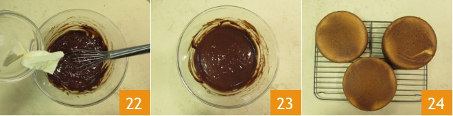 et ajoutez le beurre 22. Mélangez bien jusqu'à ce qu'il soit fondu 23. Couvrez avec du film alimentaire et gardez à température ambiante jusqu'à utilisation. Dès que les trois gâteaux seront prêts, démoulez-les sur une grille 24; de cette façon, ils refroidiront plus rapidement. Laissez refroidir une heure à température ambiante et une heure au réfrigérateur.