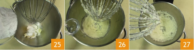 Préparez la crème au beurre. Versez le beurre mou et le sucre glace dans le bol du batteur 25. Travaillez pendant environ 1 min avec le fouet, puis ajoutez également la grappa 26. Actionnez à nouveau le batteur et travaillez la crème avec le fouet pendant environ 5 min pour obtenir un mélange lisse, mousseux et brillant 27. Réservez à température ambiante jusqu'à utilisation.