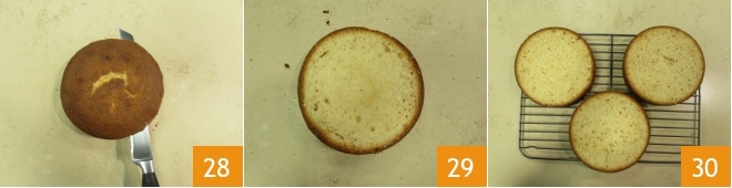 Reprenez vos bases. Taillez avec un couteau à dents longues, à la fois la surface 28, et la base 29. Réalisez cette opération pour les 3 gâteaux 30.
