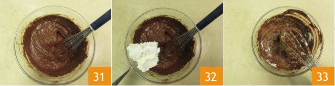 Reprenez la ganache aux framboises et travaillez-la avec un fouet 31. Ajoutez peu à peu la crème montée et mélangez délicatement 33 jusqu'à obtenir une crème homogène.