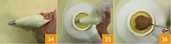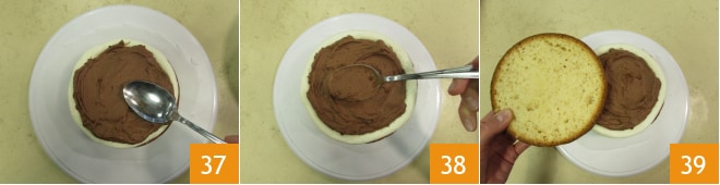 et étalez-la avec une cuillère 37. Déposez sur la crème la deuxième couche de gâteau au chocolat blanc et garnissez comme pour la première couche 38. Terminez en déposant le dernier disque de gâteau au chocolat blanc 39.