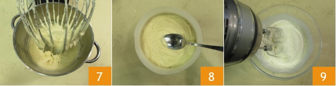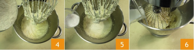 Travaillez le mélange pendant quelques secondes avec le fouet, puis ajoutez la farine 4 et la levure 5. Travaillez à nouveau le mélange avec le fouet et versez le lait en filet à température ambiante 6.