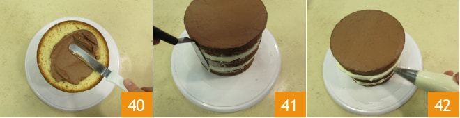 Recouvrez la surface avec la ganache restante, en la lissant bien 40. Puis, à l'aide de la spatule, lissez bien aussi les bords du gâteau 41 et laissez refroidir au réfrigérateur pendant 15 min. Reprenez le gâteau du réfrigérateur et appliquez un peu de crème au beurre sur les bords du gâteau 42.