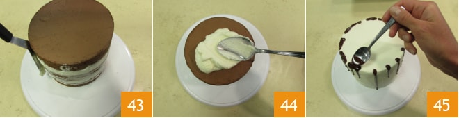 Lissez bien avec une spatule 43, puis recouvrez aussi la surface 44 et lissez à nouveau avec la spatule. Le gâteau doit être complètement recouvert de crème au beurre. Laissez refroidir au réfrigérateur pendant 1 heure. À ce stade, chauffez quelques instants la crème de couverture, et en utilisant une cuillère, réalisez l'effet drip en faisant couler un peu de sauce sur tout le bord extérieur 45. Veillez à ce que certaines gouttes descendent plus que d'autres en versant une quantité différente de ganache.