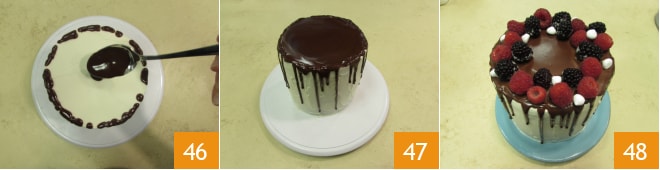 Recouvrez ensuite la surface avec la ganache de couverture restante 46 et lissez délicatement avec une spatule 47. Décorez la surface avec les framboises et les mûres, en terminant par quelques petites meringues 48. La drip cake est prête à être servie.