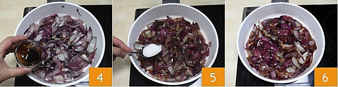 Quand les oignons rouges commencent à ramollir, ajoutez le vinaigre balsamique 4 et le sucre 5. Salez à votre goût et laissez mijoter jusqu'à ce qu'ils atteignent une consistance tendre mais pas trop cuite 6.