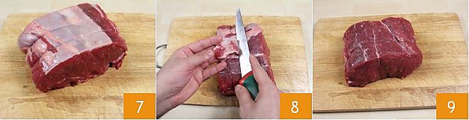Occupez-vous maintenant de la viande : sortez la viande du réfrigérateur au moins une heure avant de la cuisiner, pour qu'elle ne soit pas trop froide mais à température ambiante. Placez le contre-filet ou l'entrecôte sur une planche à découper 7 et avec un couteau bien aiguisé, éliminez la couche de graisse en surface 8 jusqu'à l'avoir complètement dégraissée 9.
