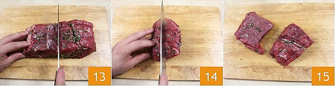 Transférez à nouveau la viande que vous avez aromatisée sur la planche à découper et divisez-la en deux 13, puis coupez chaque pièce obtenue en deux 14 pour obtenir 4 steaks 15.