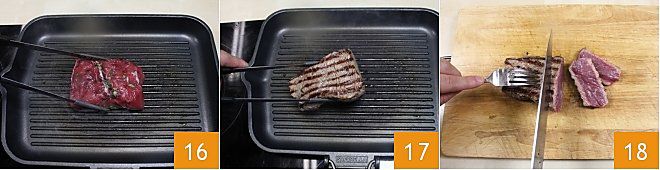 Faites chauffer très bien une poêle-grill ou une poêle antiadhésive et saisissez les steaks des deux côtés (16-17) jusqu'à atteindre le degré de cuisson souhaité. Si vous préférez que l'intérieur reste rosé et pas sec, faites cuire au maximum 4-5 minutes. Évitez de piquer la viande pendant la cuisson pour éviter que ses jus ne s'échappent. Une fois cuite, transférez le steak sur une planche et coupez-le en biais pour obtenir des tranches plus précises et compactes 18.