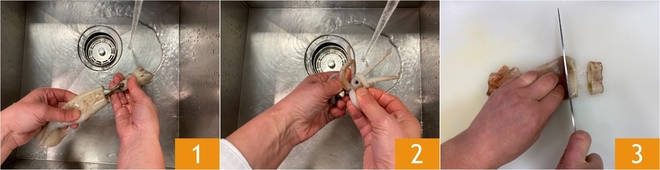 Pour préparer les encornets mijotés, commencez par le Comment nettoyer les calmars : séparez les corps des tentacules et retirez le stylet, la fine baguette de cartilage transparent qui se trouve à l'intérieur du manteau 1. Sortez les entrailles et rincez le corps et les tentacules sous l'eau courante 2. Une fois nettoyés, coupez les corps en anneaux réguliers 3