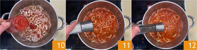 Versez la purée de tomates 10, puis ajustez avec du sel 11 et du poivre 12.