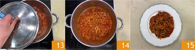 Mélangez, couvrez avec un couvercle en laissant juste une petite ouverture pour laisser échapper la vapeur 13 et poursuivez la cuisson pendant environ vingt minutes, jusqu'à ce que les encornets soient tendres et que la sauce soit épaisse et parfumée 14. Servez les encornets mijotés bien chauds, accompagnés de pain grillé pour recueillir la sauce savoureuse 15.
