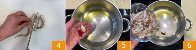 Divisez les tentacules en deux ou en quatre, selon leur taille 4. Dans une grande casserole, versez un filet d'huile d'olive extra vierge, ajoutez l'ail et le piment 5, faites revenir quelques minutes à feu doux, jusqu'à ce que l'ail soit doré. Ajoutez les encornets 6 et faites bien imprégner.