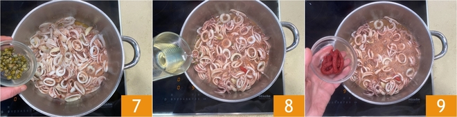 Ajoutez également les câpres dessalées 7. Après environ deux minutes, déglacez avec le vin blanc 8 et laissez évaporer complètement l'alcool. À ce stade, incorporez le concentré de tomate 9