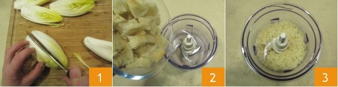 Pour préparer les endives belges gratinées, commencez par préchauffer le four à 200° en mode statique, puis rincez les endives sous l'eau courante et coupez-les en deux dans le sens de la longueur avec un couteau 1. Mettez les endives de côté et passez à la préparation de la panure : coupez le pain rassis en cubes, puis mettez-le dans un mixeur 2 et mixez-le pour le réduire en miettes uniformes 3.