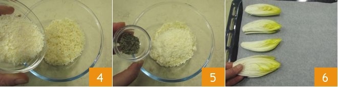 Transférez le pain rassis émietté dans un bol, ajoutez le parmesan râpé 4 et l'origan 5, puis assaisonnez avec du sel et du poivre et mélangez bien le tout. Maintenant, prenez une plaque de cuisson tapissée de papier sulfurisé et disposez les endives belges que vous aviez coupées précédemment, partie extérieure vers le bas 6.