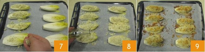 Répartissez la panure sur les endives belges en essayant de les couvrir entièrement 7, puis ajoutez un filet d'huile 8 et faites cuire au four statique à 200° pendant environ 15 minutes, jusqu'à ce que la panure soit bien dorée 9. Vos endives belges gratinées sont prêtes à être servies !