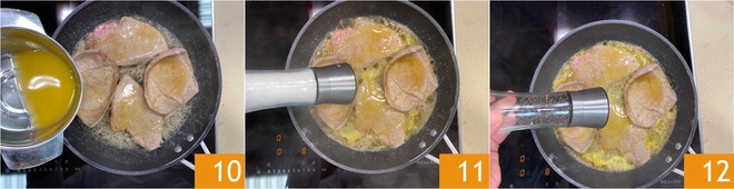 Faites dorer les tranches également de l'autre côté pendant 1 à 2 minutes, puis versez le jus d'orange 10. Assaisonnez de sel 11 et de poivre 12.