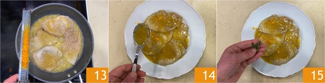 Ajoutez la majeure partie du zeste d'orange râpé 13 ; mélangez bien pour dissoudre le fond de cuisson et retournez les tranches quelques fois pour les imprégner. Poursuivez la cuisson à feu doux pendant quelques minutes, jusqu'à ce que le fond épaississe et devienne crémeux ; en tout, il faudra environ 8 minutes. A ce stade, il ne vous reste plus qu'à dresser vos escalopes à l'orange : transférez-les dans un plat de service, ajoutez la sauce 14 et quelques feuilles de thym 15.