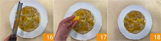 Terminez avec un peu de zeste d'orange réservé 16, les quartiers à vif 17 et servez vos escalopes à l'orange bien chaudes 18 !