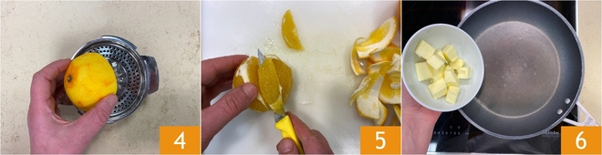 Pressez une des oranges 4 : vous devez obtenir environ 80 g de jus. Pelez à vif l'orange restante et séparez les quartiers à l'aide d'un petit couteau 5. Versez le beurre dans une large poêle 6 et laissez-le fondre à feu doux.