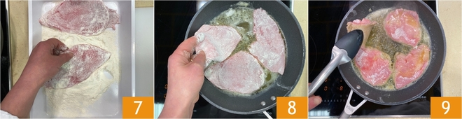 Entre-temps, farinez les tranches de viande une par une, en éliminant l'excès de farine en les secouant légèrement 7. Quand le beurre est complètement fondu, augmentez légèrement le feu et placez les tranches dans la poêle 8. Laissez-les dorer pendant 1 à 2 minutes, puis retournez-les 9.