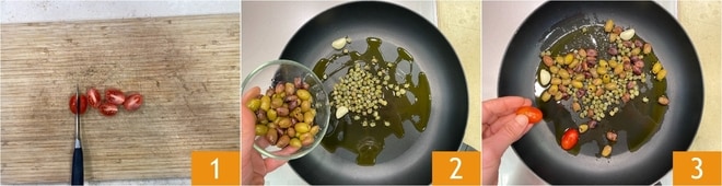 Pour préparer les escalopes de poulet savoureuses, commencez par laver les tomates cerises et les couper en deux 1. Dans une grande poêle, versez un filet d'huile, 2 gousses d'ail, les câpres et les olives 2. Allumez le feu et placez les tomates cerises côté coupé en contact avec la poêle 3.