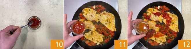 Entre-temps, dissolvez le concentré de tomate dans un peu d'eau 10. Ajoutez-le dans la poêle 11 et ajoutez le reste de l'eau pour bien nettoyer le bol 12.