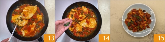 Mélangez bien 13 et poursuivez la cuisson encore quelques minutes. À ce stade, ajoutez les feuilles d'origan frais 14, juste une pincée de sel, de poivre et servez vos escalopes bien chaudes 15.