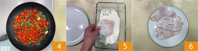 Laissez cuire à feu moyen-élevé pendant environ 5 minutes 4. Pendant ce temps, vérifiez que les tranches de poulet soient fines, sinon aplatissez-les avec un attendrisseur de viande. Farinez les filets de poitrine de poulet de tous les côtés 5, secouez pour enlever l'excès et disposez-les sur une assiette au fur et à mesure 6.