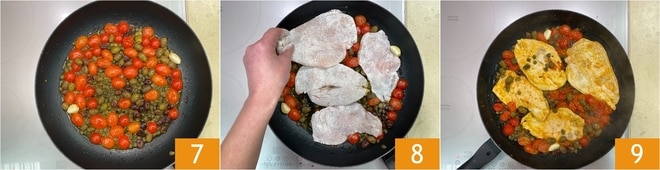 Lorsque les tomates cerises sont bien rissolées 7, disposez les filets de poitrine de poulet dans la poêle 8. Faites-les dorer pendant quelques minutes, puis retournez-les à l'aide de pinces et faites-les dorer de l'autre côté également 9.