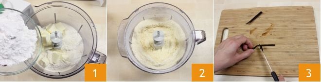 Pour préparer les visages de pâte sablée avec chocolat et confiture, commencez par la pâte sablée : dans un mixeur, versez la farine, le beurre froid en morceaux, une pincée de sel et le sucre glace 1, puis mixez le tout pendant quelques secondes jusqu'à obtenir un mélange sableux 2. Renversez-le sur un plan de travail en formant un puits. Incisez la demi-gousse de vanille et grattez avec un couteau les graines à l'intérieur 3.