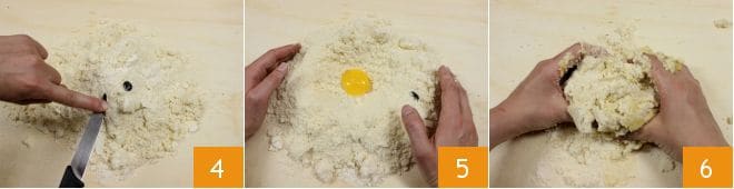 Ajoutez les graines de vanille au centre du puits 4, ajoutez également le jaune d'œuf 5 et pétrissez brièvement 6.