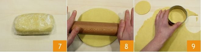 Formez une boule et enveloppez-la de film plastique 7, puis placez-la au réfrigérateur pour qu'elle durcisse pendant au moins 30 minutes. Une fois le temps écoulé, étalez la pâte sablée en une feuille de ½ cm 8. Avec un emporte-pièce circulaire d'environ 10 cm de diamètre, découpez 8 formes 9.