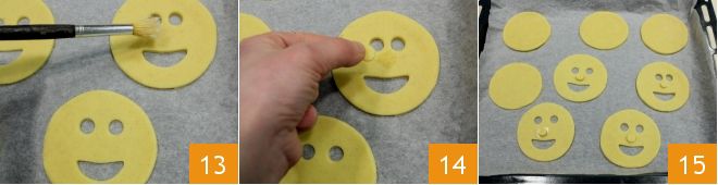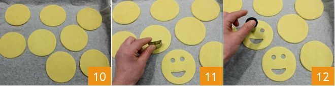 Déposez les disques sur une plaque tapissée de papier sulfurisé 10, puis avec un emporte-pièce en forme de croissant de lune, réalisez sur la moitié d'entre eux des bouches souriantes 11 (à défaut, vous pouvez utiliser la pointe d'un couteau pour découper le sourire à la main), créez ensuite les yeux avec un emporte-pièce de 2 cm de diamètre 12. La découpe de pâte dans ce cas vous servira à réaliser le nez des visages.
