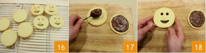 Une fois cuits, sortez-les du four et laissez-les refroidir complètement sur une grille 16. À ce stade, garnissez 2 disques pleins avec la Nutella 17 et déposez les visages de pâte sablée 18.