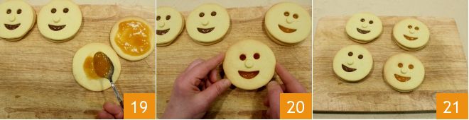 Vous pouvez garnir les deux autres disques restants avec la confiture 19 et les refermer avec les visages 20. Servez les visages de pâte sablée avec chocolat et confiture à vos enfants pour un goûter joyeux 21!
